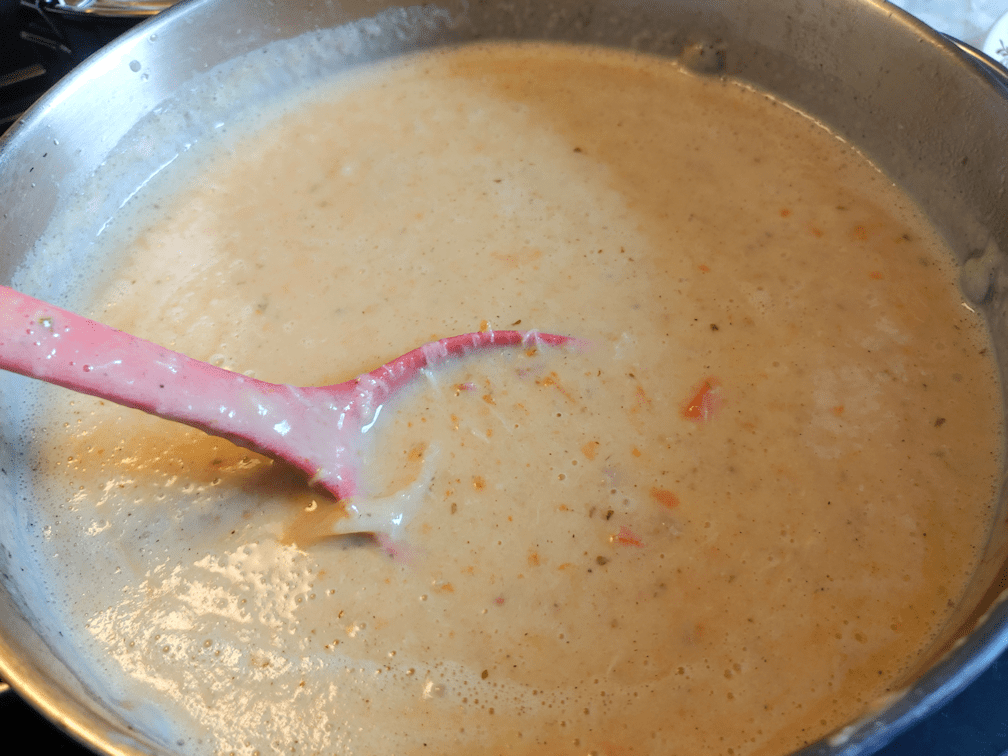 This is the soup after the cream and mustard powder has been incorporated. You could skip the next step, if you like a thinner, chunkier soup.