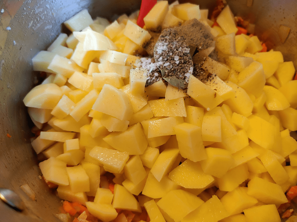 Once the liquid has been brought to a boil, reduce heat and simmer for the time needed to cook the potatoes, minus the time needed to cook the egg noodles or pasta. So if the size of potato cubes you cut need 20 minutes, and you’re using pasta that needs 8 minutes to cook, simmer for 12 minutes.