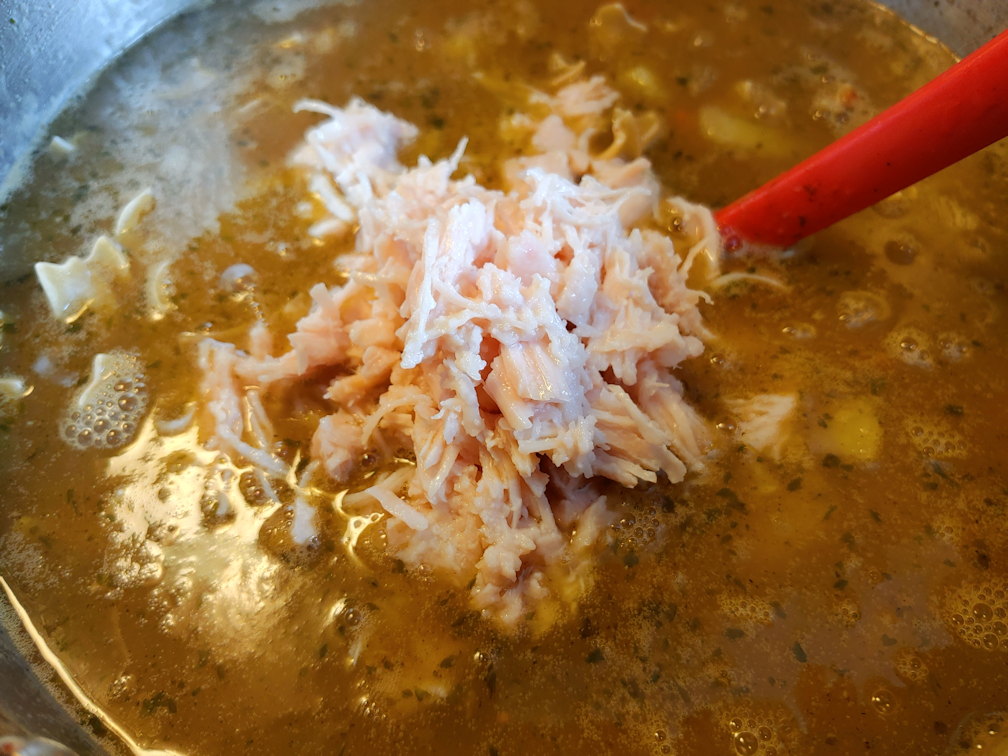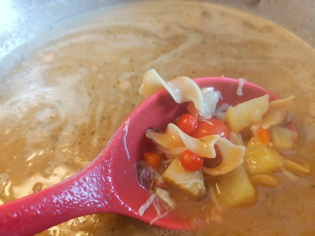 Add cooked chicken chunks and return to a simmer for a few more minutes, or until the potato chunks are fully cooked, stirring frequently.