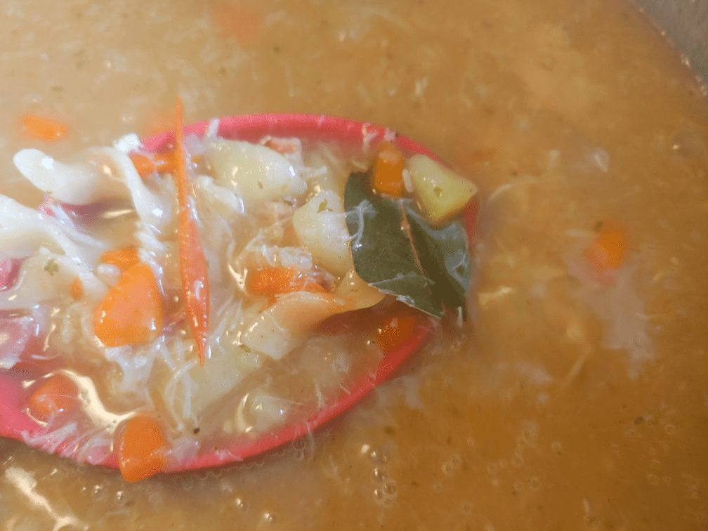 Today, I decided to take most of what’s been slowly building up to make a large soup. We roasted a couple of chickens yesterday, so that was my main protein.
