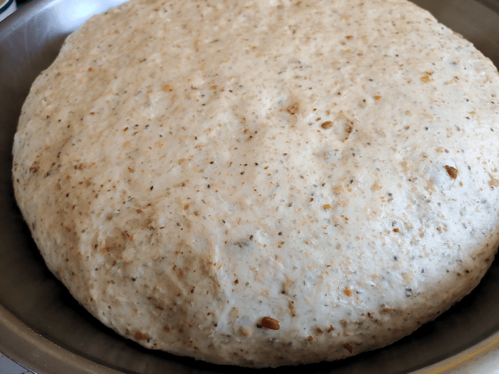 This is how it looked after only 1 hour of rising time. The bowl it’s in is pretty huge – too big to fit in our kitchen sink (which makes washing it a bit of a challenge! :-D ) – with plenty of room for this 4 loaf recipe.