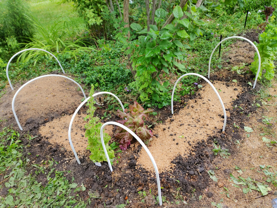 Then it was time to get back to the garlic bed, and clear away the hoops. With the twine marking the three rows of garlic, I used those as a guide while using stick to create furrows in between. I went back over them with my hands to lightly compact the bottoms for better soil contact – and remove as many little rocks as I was able to!