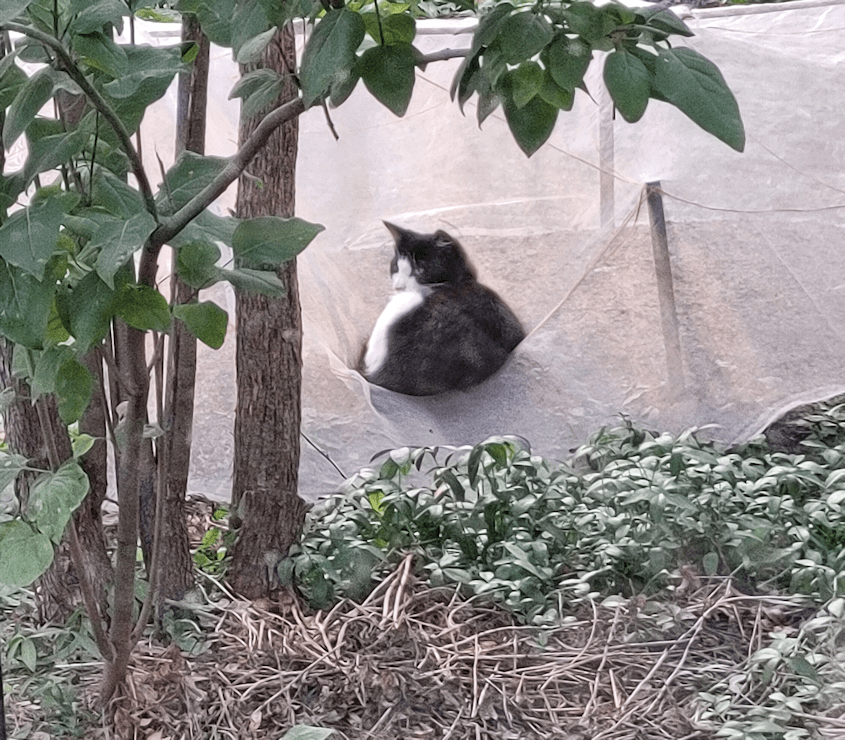 The boards and bricks that had weighted down the sides against the hoops before are now being used to keep the plastic snug against the soil, and from blowing away. I found a short log that I could roll the excess up into. Later on, I did take all those rocks you can see at the end, and set them on the plastic, under the roll. It is slightly elevated, and the wind was moving it around quite a bit, considering how litter wind we had today. The rocks weighing down the other end weren’t enough, so I found a short board I could wrap the plastic around and weighted that down with the rocks. If it were spring, this would be a good solarization set up. For now, it’ll just keep the soil a bit warmer, and keep the cats from leaving me more “presents”. 😄