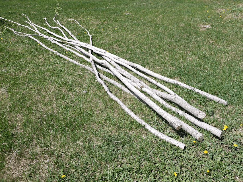 The smaller and thinner ones will also be used in various ways, including cross pieces and supports on the squash tunnel. My daughter added quite a bit more to this pile, then everything got moved to the stacks by the side of the house, closer to the garden. A nice shady place were we will be able to pre-assemble parts of the squash tunnel.