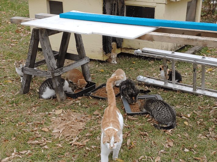 The little kittens now come out to the food bowls here, consistently. Though I have seen one or two explore inside the cat house, they prefer to hide under it, rather than in it!