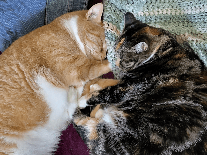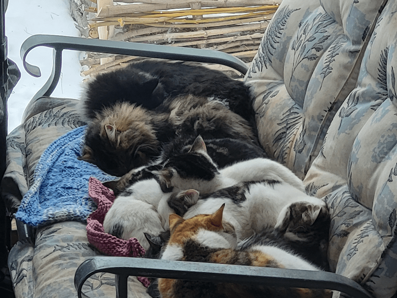 The outside cats are even feeling it! I hate having to close them out of the sun room for the night, after luring them out with their second feeding of the day. Some of them ended up overturning a garbage can and were making a mess. At least I know they can’t get into the bin with the kibble, but if racoons get in, they can literally tear the bin apart, as they’ve already done with the old bin we had to replace because of them.