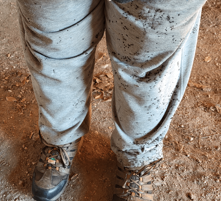 This happened while I was clearing bush to access the tree I needed to debranch and cut to size. These are tiny burrs from a weed that has the prettiest, daintiest flowers that become these horrible things. I’ve been pulling them up every time I see them, but once the flowers are done blooming, they’re really hard to see.