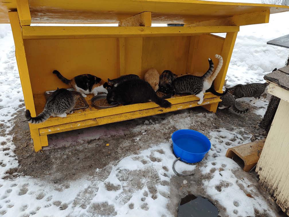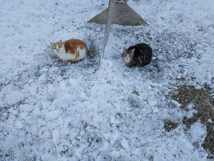 The heated water bowl was still plugged in. :-D There was almost no water left, though, so we had some thirsty, as well as hungry, kitties!