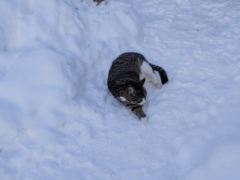The cats are handling the snow very well. They all have their dense winter fur. That’s a relief. Fenrir became an inside cat because she doesn’t have the undercoat, and would not have survived her first winter, if we hadn’t brought her in. I don’t know where she came from, but our local stock are well adapted to the cold!