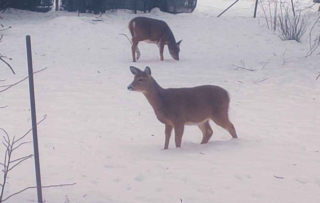 The snow was gone in a lot of places before the storm hit a couple of days ago. I could even see green grass through last year’s thatch. So it was no surprise that we’ve seen virtually no deer. Even in the trail cam facing where they cross the road to our place went from streams of dozens of deer to … nothing. In just a couple of days.