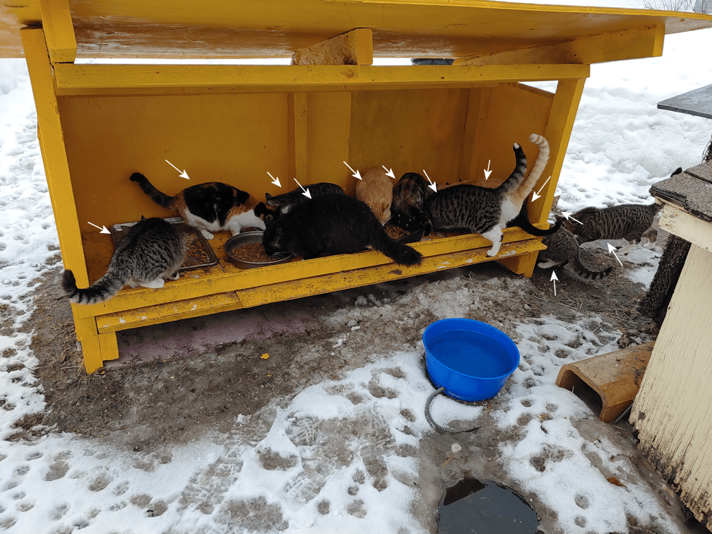 Along with these twelve, there were three more in the sun room. Not quite all of the yard cats, but close!
