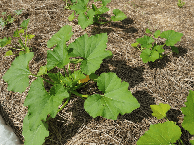 The size difference between some of these plants is rather remarkable! Some are still so tiny. I don’t know how much of that is due to the different types of squash, or to any health problems or weather damage. The first squash bed has just a few survivors, struggling to grow. This is the one that got frost damaged, even though we covered them for the night. The rest were all transplanted at the same time, so it’s more likely the differences there are due to type, not damage.