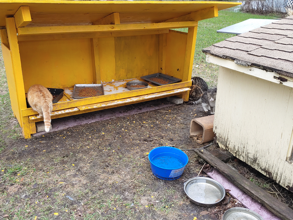 The outside cats are much more laid back these days, when I bring the kibble out. For the past few months, I’d have a crowd of cats outside the sunroom door, meowing plaintively. These days, when they here the kibble hitting the trays, they just saunter over. By the time I finished putting food out for them and the birds, there were 8 cats milling about, and I saw a couple of others show up some time later. Though we still see skunks in the kibble house, they, too, are not desperate for food anymore, and we’re needing to put food out just once a day now. We’re even seeing the deer far less; I’m catching them on the trail cams more often than actually seeing them myself.