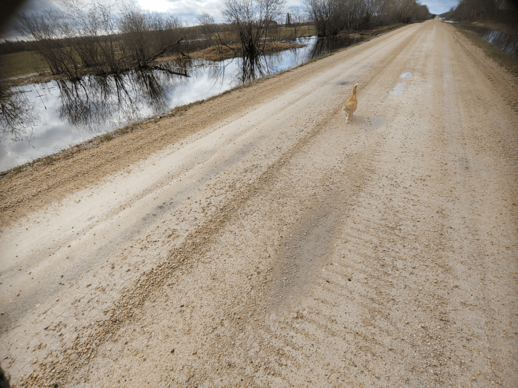 I was going to go and check the washed out road, but Rolando Moon started to follow me. Her coat isn’t much different from the colour of the road, so I decided to lead her back home. She even let me carry her for short distances, without trying to claw my face off. :-D