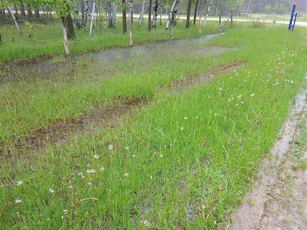 Most of the inner yard is so very wet. I’m seeing standing water where I don’t remember ever seeing standing water before. The storage house has a moat around it again, but the spot between the storage house and the corner of the old kitchen garden just keeps growing. When cats or skunks get startled, they still run through it, so I get a good idea of just how deep it is!