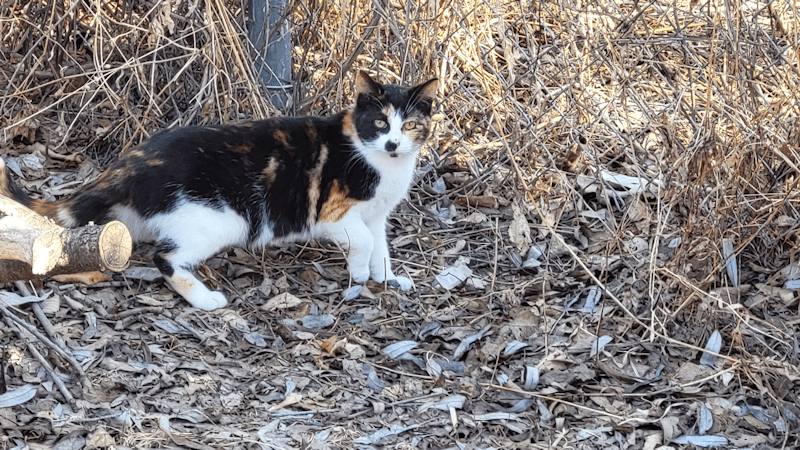 I was able to get a picture with Rosencrantz’ tortie! It is the shiest of the bunch. I was able to pet the one at the pack a little bit, at least. Rosencrantz herself acts like she wants to be petted, will stretch out to sniff my fingers, bump her head against my hand – then try to bite and scratch me, too! She used to be much more friendly.