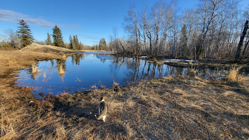 Normally, this area has water only during spring melt. There is a sort of “river” that heads off to the right in the photo, all the way to the road, where there is a large culvert, and continues north in someone else’s property. To the left, it goes into the field and joins up with the municipal drainage ditch. The group of trees in the middle become an island, but right now, we have another pond!