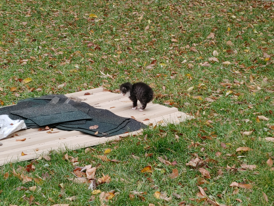 The cat had gone outside again, though, so we went around to look for him. They built a cat shelter against the back of the house, and sure enough, up popped a familiar face! It was, indeed, Potato Beetle. Once he recognized me, he came right over for cuddles!