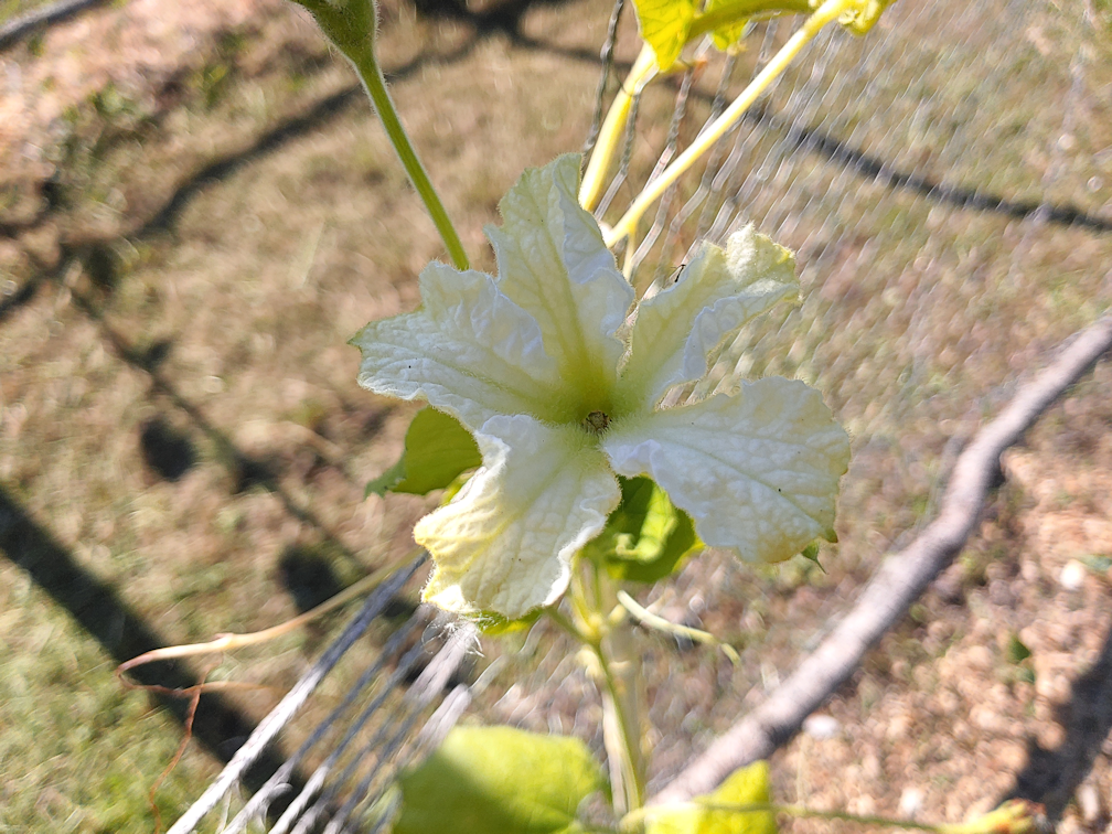 This is an apple gourd! I’m hoping it was pollinated and will continue growing. It looks like 3 of the 4 apple gourd plants are going to be productive, but this one is definitely the largest and strongest. The fourth one remains barely visible!