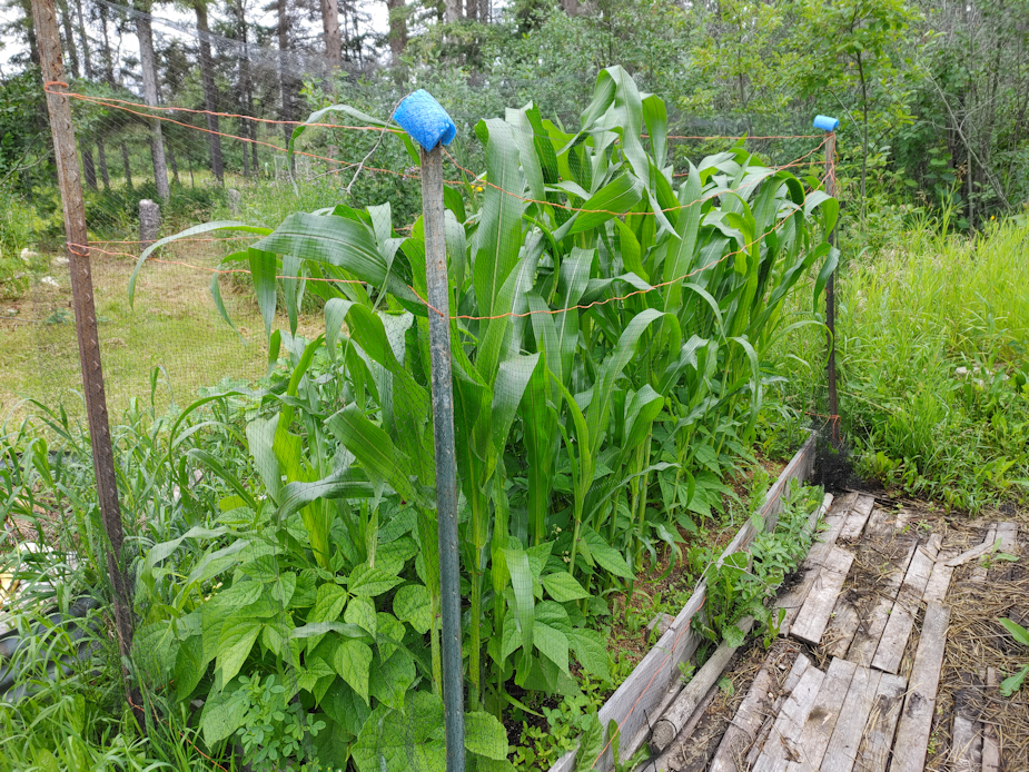 The kulli corn is getting nice and tall! It’s time to take the net off and see if we can wrap it around the side, leaving the top open, for the corn to reach its full height.