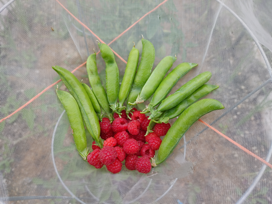 I did manage to have a sad little harvest this morning. A handful of the shelling peas, and a few raspberries.