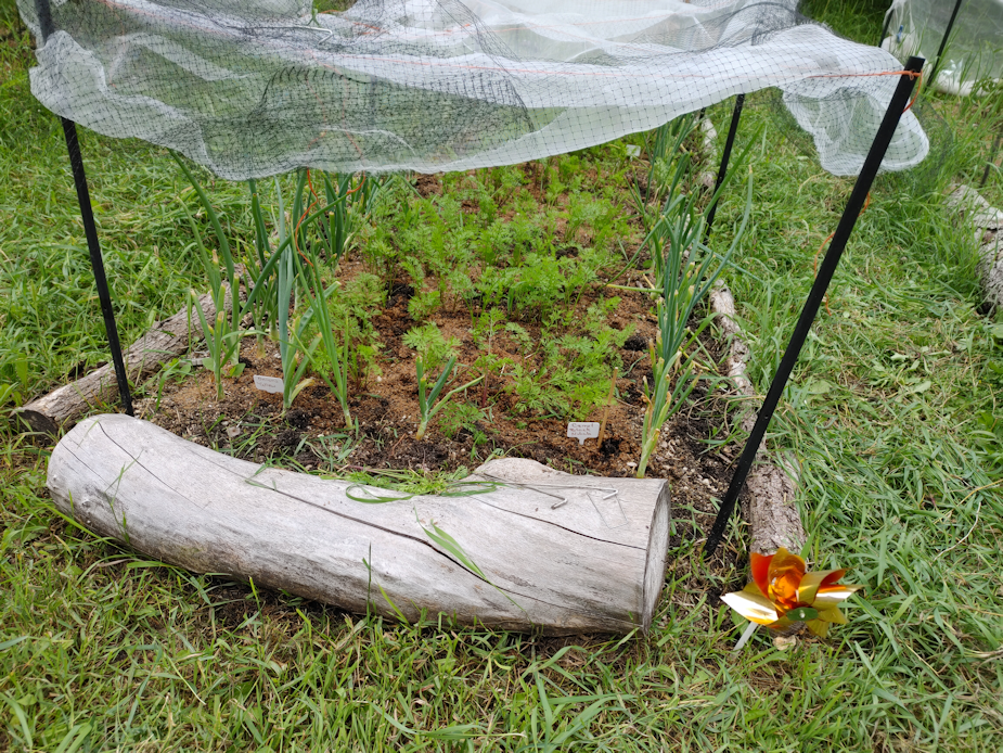 Hopefully, this will be enough to protect the area until the seeds germinate and get big enough that they won’t need the hoops and netting anymore. The nasturtium are edible, but they can also act as a trip crop, to keep insects away from other edible greens.