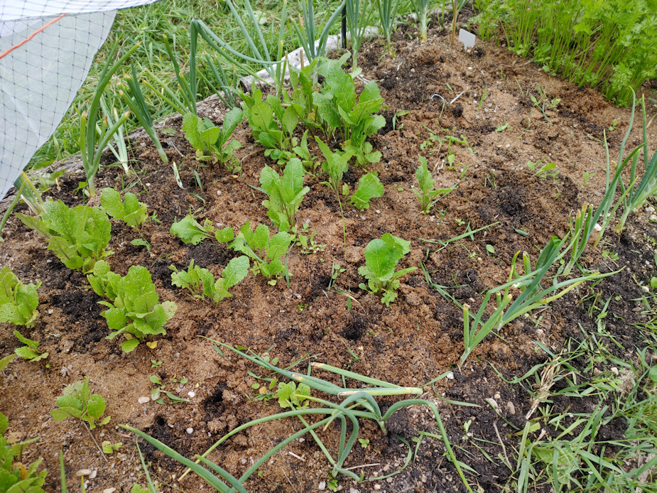 There aren’t a lot of the one type of turnip, but at least there’s something. The Gold Ball turnip are simply gone. They were the first to germinate, and disappeared almost immediately. I’d hoped that, while weeding, I might find some survivors, but there’s nothing. I don’t know what ate them, any more than I know what is leaving so many holes in the other turnips. We planted 3 types of turnips, but only one has survived – so far.
