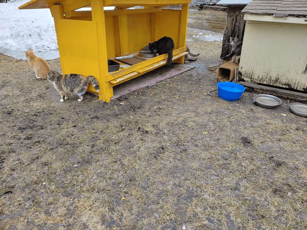 I wasn’t able to see much of the kittens through the biggest cat’s house window, but when the girls went out later, they were surprised to see several adult cat heads, peering at them through the window! They were able to see a kitten behind them, but didn’t want to stay too long or get too close and disturb them. I’m surprised about the other cats. Since Junk Pile had her kittens, I’ve only seen her in there.