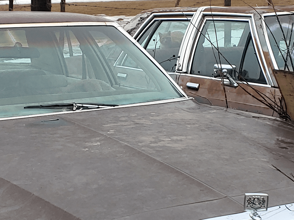 One of the areas I checked out was the shed where my parents’ belongings are stored. There are several abandoned cars near is, one of which has a window that’s partly open. As I got closer, two cats exploded out of the window and ran off.