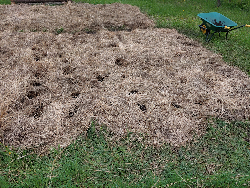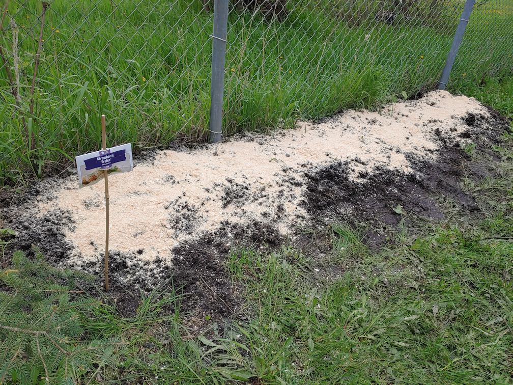 The asparagus bed had been well mulched for the winter. When we transplanted the strawberries, the straw mulch was moved to around the bed, and wood shavings were added for a lighter mulch on top of the bed. That was done in early June and when the straw was moved, we could see that some asparagus spears were starting to make their way through the straw.