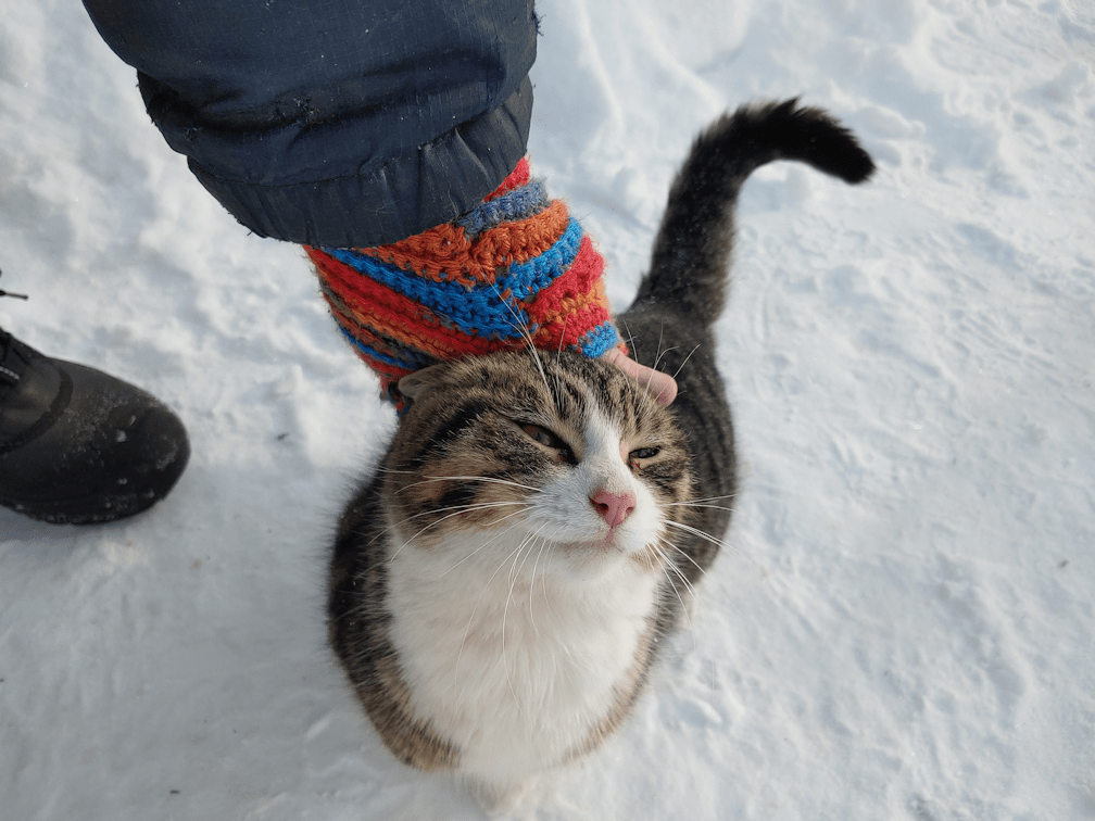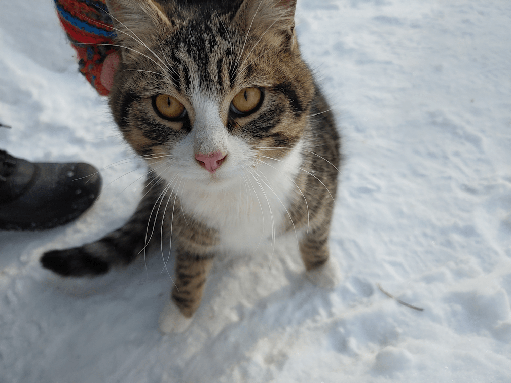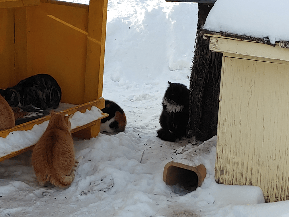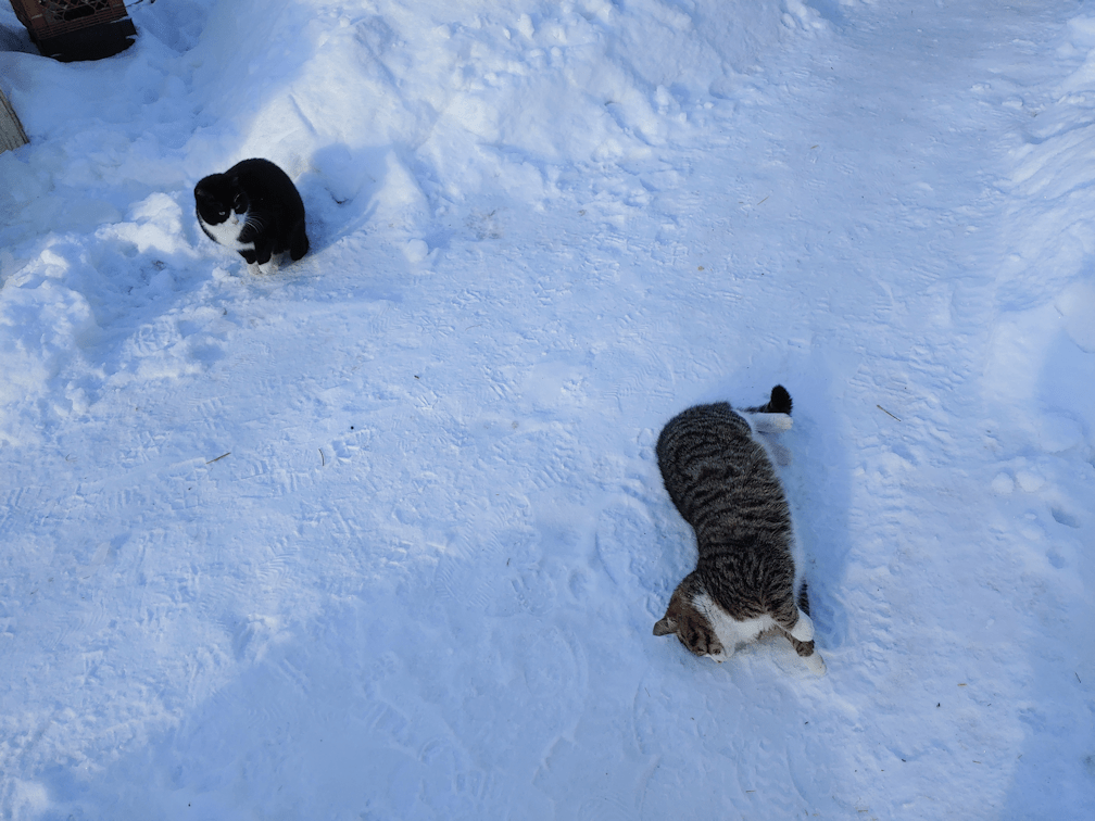 It’s warm enough for the kitties to come out for breakfast, though Caramel’s expression looks like one of supreme displeasure! :-D