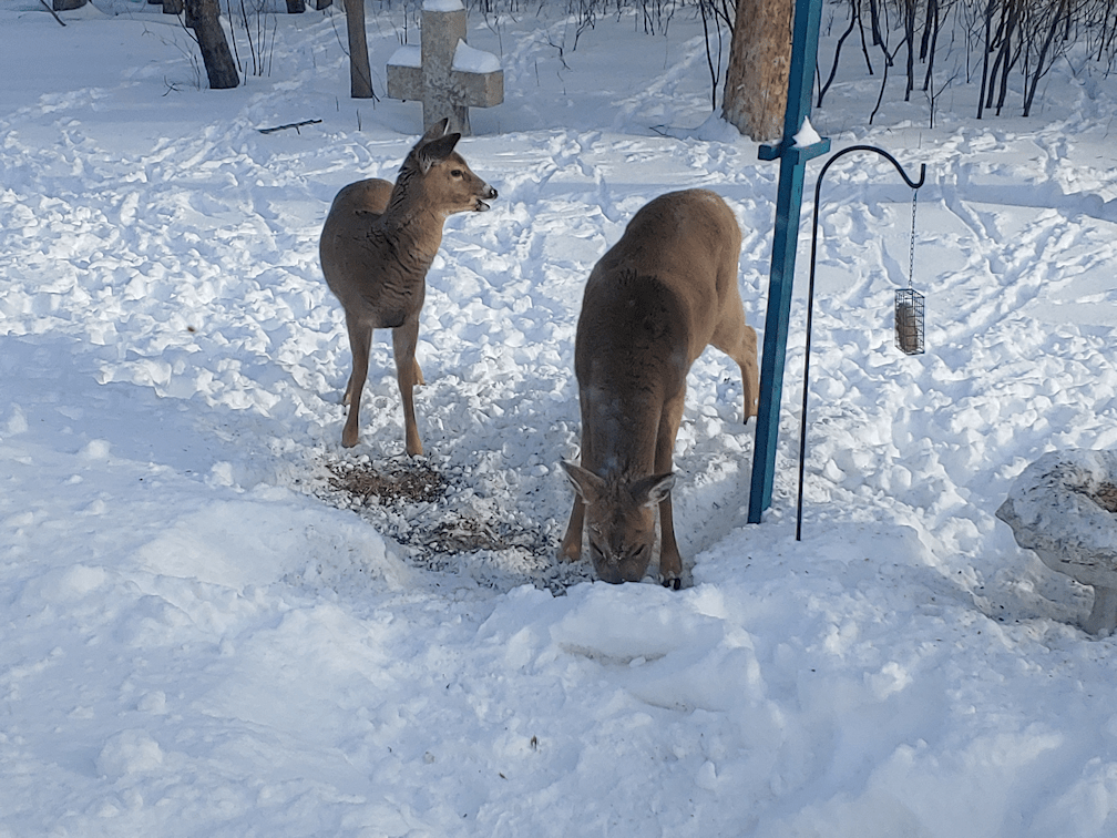 I had deer hanging around the north yard and waiting for me to be done. It was the usual pair, at first. Then this one showed up.