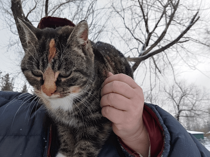 The whole area is still nekkid. The fur is not really growing back at all, yet. Which means she’s cold, all on the inside of her thigh. Which is better than a gaping wound, of course, but I can tell she’s uncomfortable when she sits in the snow.