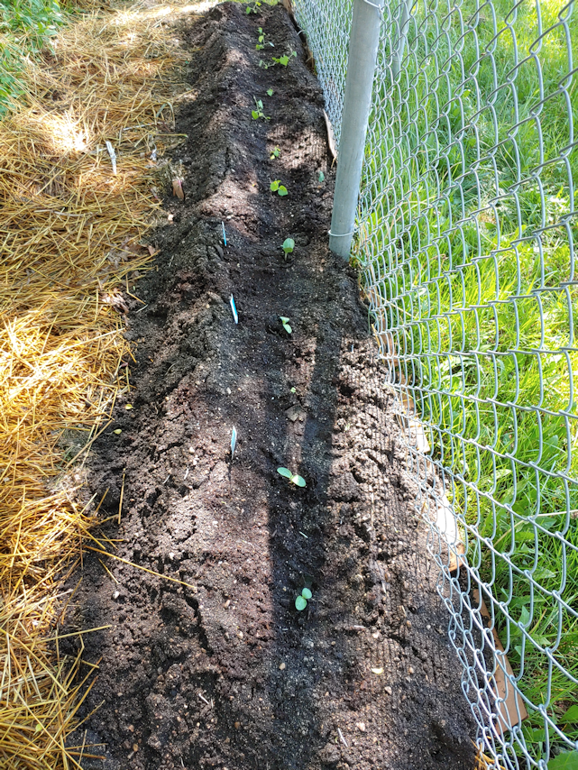 Of course, I had to check the newest transplants. We got another heavy rain last night, that lasted for a couple of hours. They seem to have handled it quite well. I took this photo from the gourd end of the row. In the foreground are the 4 Ozark Nest Egg gourds (you can just barely see one of them, it’s so tiny!). By the fence post is the Thai Bottle gourd. You can’t see it in the photo, but hidden under one of the leaves is a second sprout!