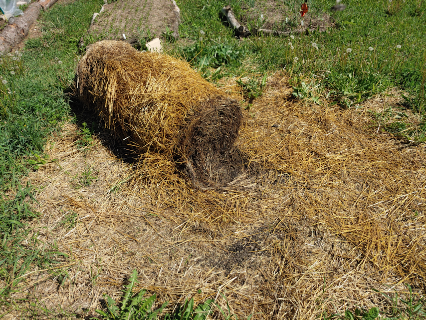 This is what’s left of our straw! I’d taken so much from the bottom, where it was breaking down the most, that the whole thing finally just fell over. We should have enough to mulch the summer squash, and hopefully have some to add to the transplants at the squash tunnel, but I doubt there will be much left by then. I’ll have to contact the renter to see about getting another bale. Hopefully, I’ll be able to get hay next time. I’m deliberately asking for older bales that aren’t good for feed anymore, since it will be used only for mulching, but when I asked about it last time, they had none, as they spread them on their crop fields and plow them under to amend the soil.