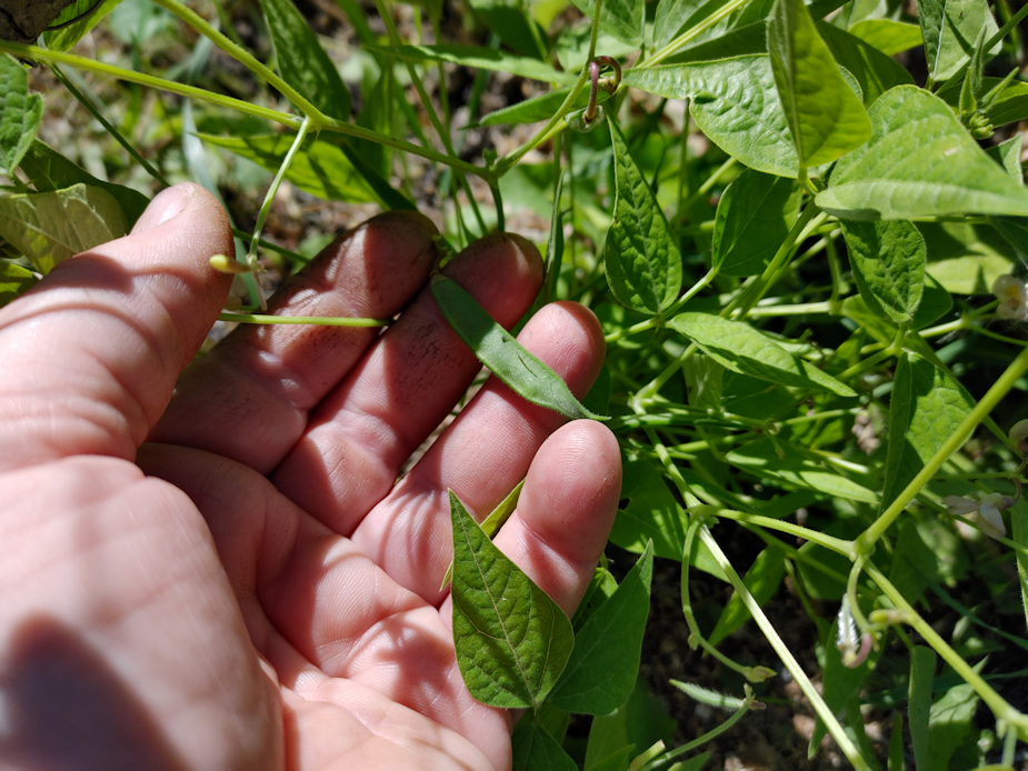 There are ripe pods hidden among the greens! It turns out these beans start developing right near the ground, unlike the Carminat, which have no flowers or pods at all near the ground.