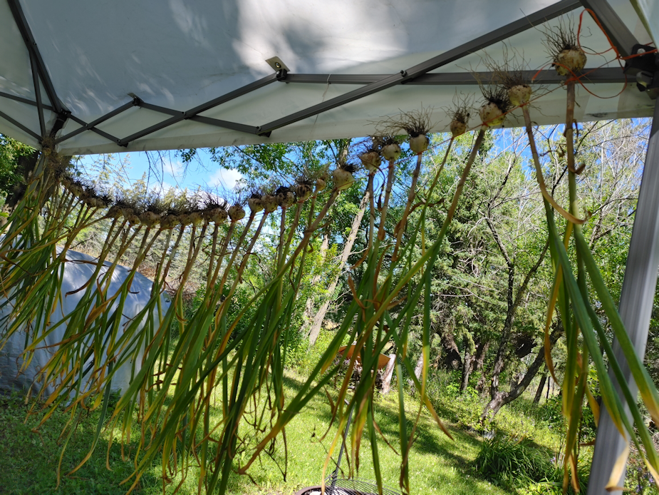 The freshly picked garlic is now strung up under my daughter’s old market tent, where it can get plenty of air circulation as it cures, and we won’t have to worry about it being rained on.