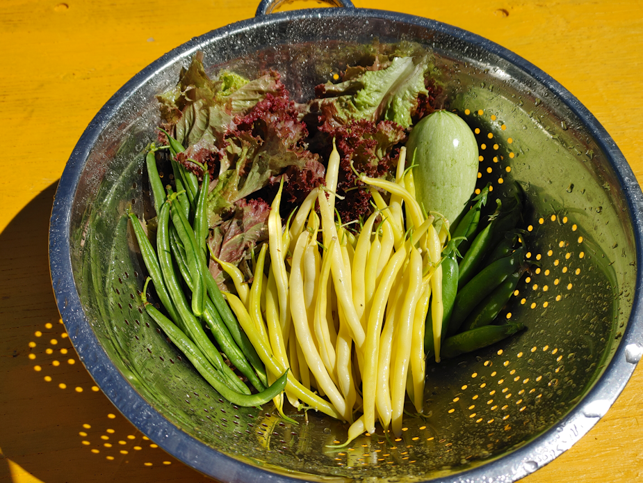 There was have it. Our very first harvest of green bush beans, planted late to replace the ones that drowned out.