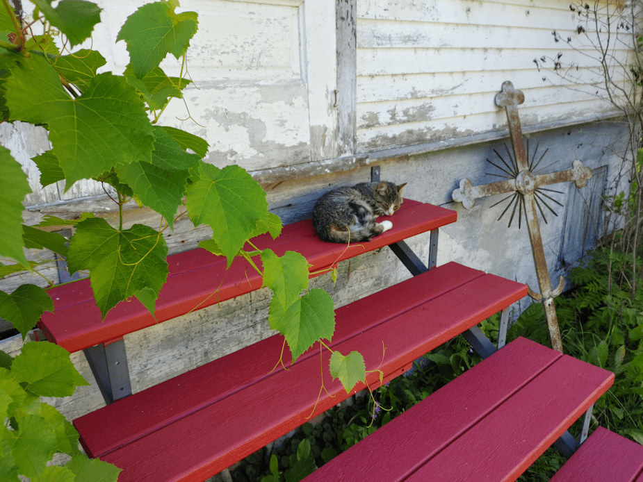 I topped up the kibble trays before going inside, including the one near the grape vine. Earlier, I’d seen the newest group of kittens playing around the shrine, so I made sure that container had plenty of kibble, too.