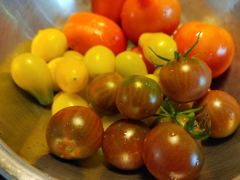 Along with the Yellow Pear tomatoes, there were about five or six Chocolate Cherry tomatoes, and two Cup of Moldova tomatoes on hand, so they wall went into the pot together!