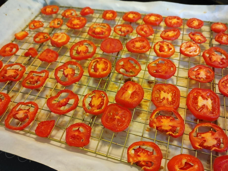 A lot of the tomatoes we set up in the sun room are slowly ripening. There isn’t enough to bother cooking them into a sauce or whatever, but more than we can conveniently eat, so I’ve started dehydrating them in the oven.